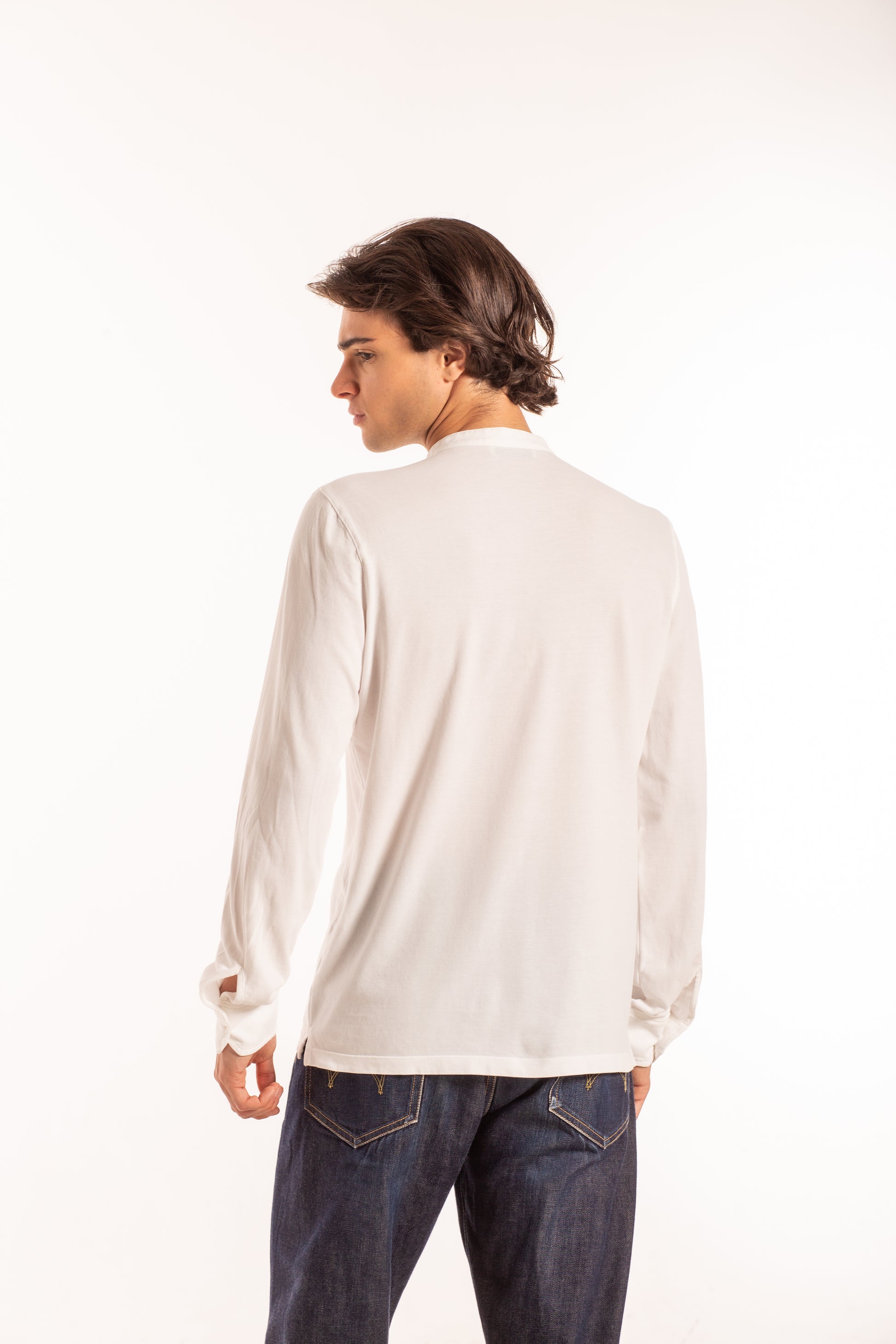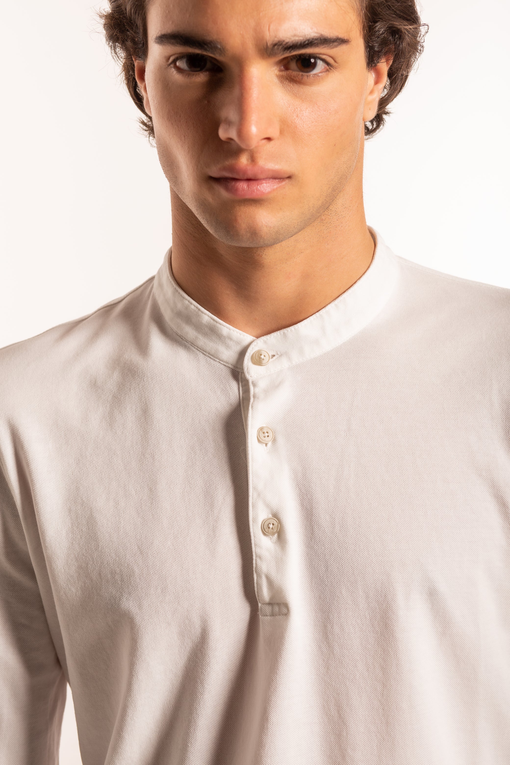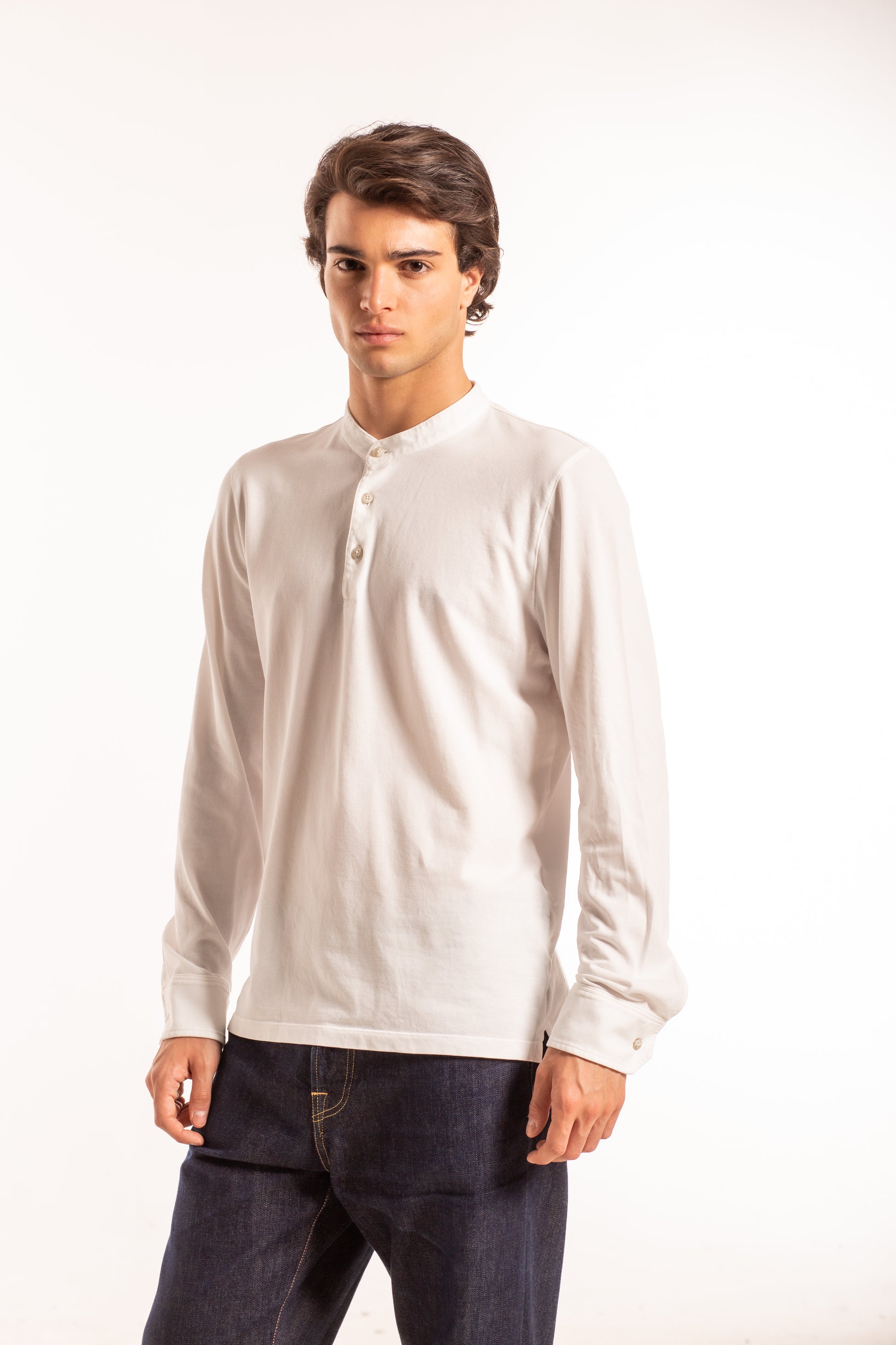 Camicia a manica lunga con colletto coreano e apertura a tre bottoni, dal design essenziale e contemporaneo.