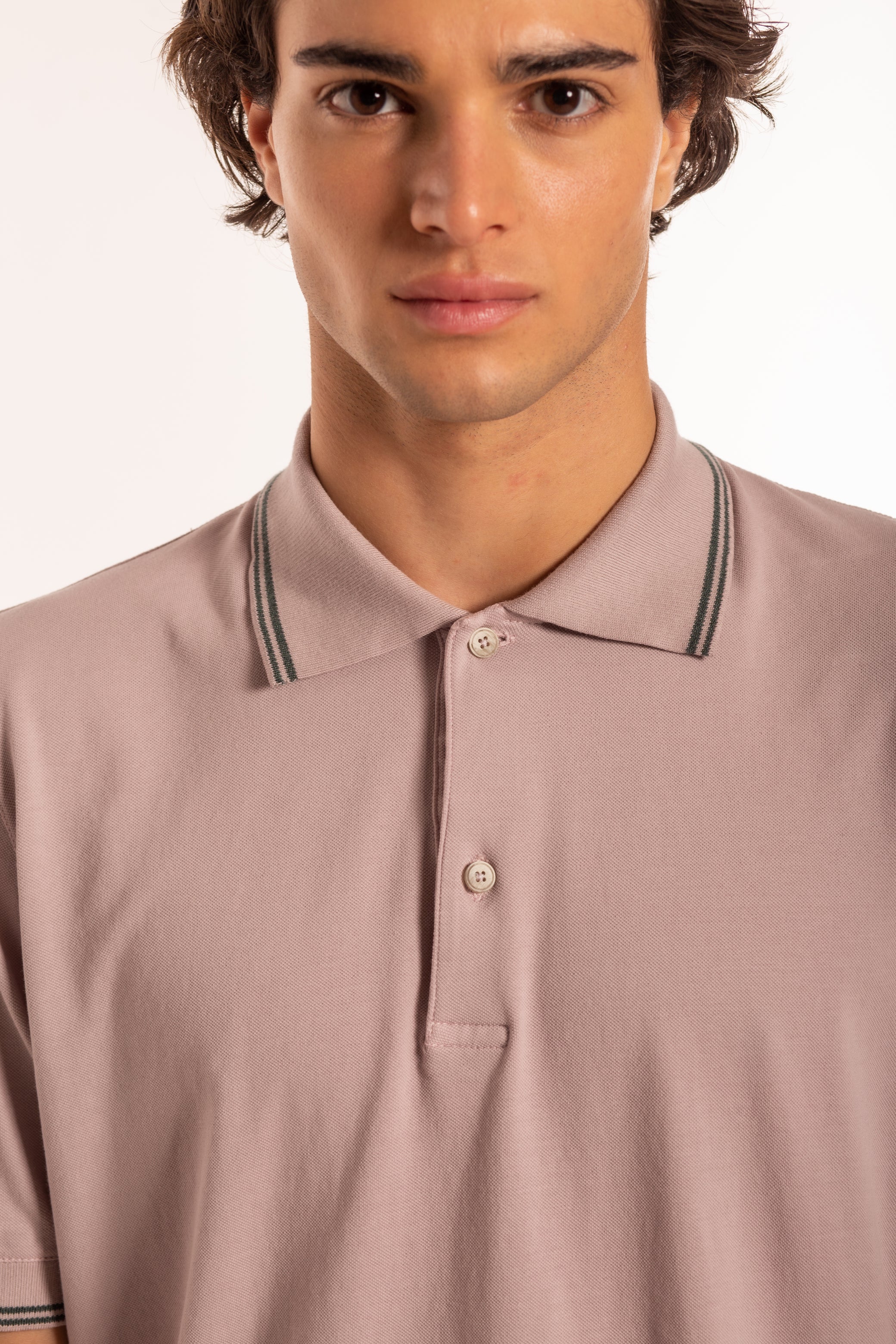 Polo a mezza manica con colletto e apertura a due bottoni, arricchita da righe a contrasto che donano un tocco distintivo.