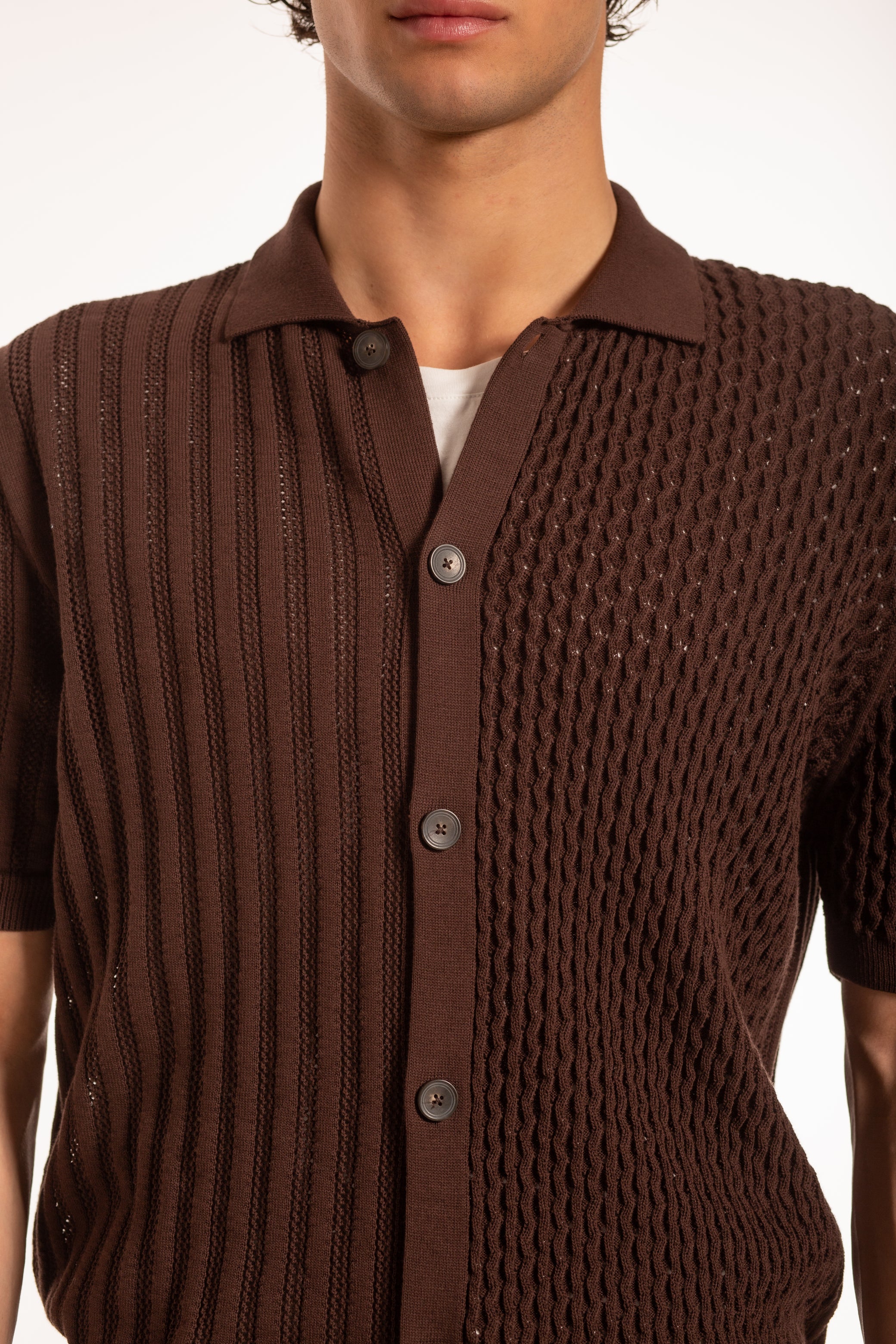 Camicia con colletto polo e chiusura con bottoni, modello iconico in patchwork con punti maglia traforati che creano un elegante gioco di texture e profondità. Realizzata in cotone crêpe, un materiale dalla mano fresca e croccante, caratterizzato da una struttura leggera e traspirante che assicura comfort e vestibilità perfetta tutto il giorno.