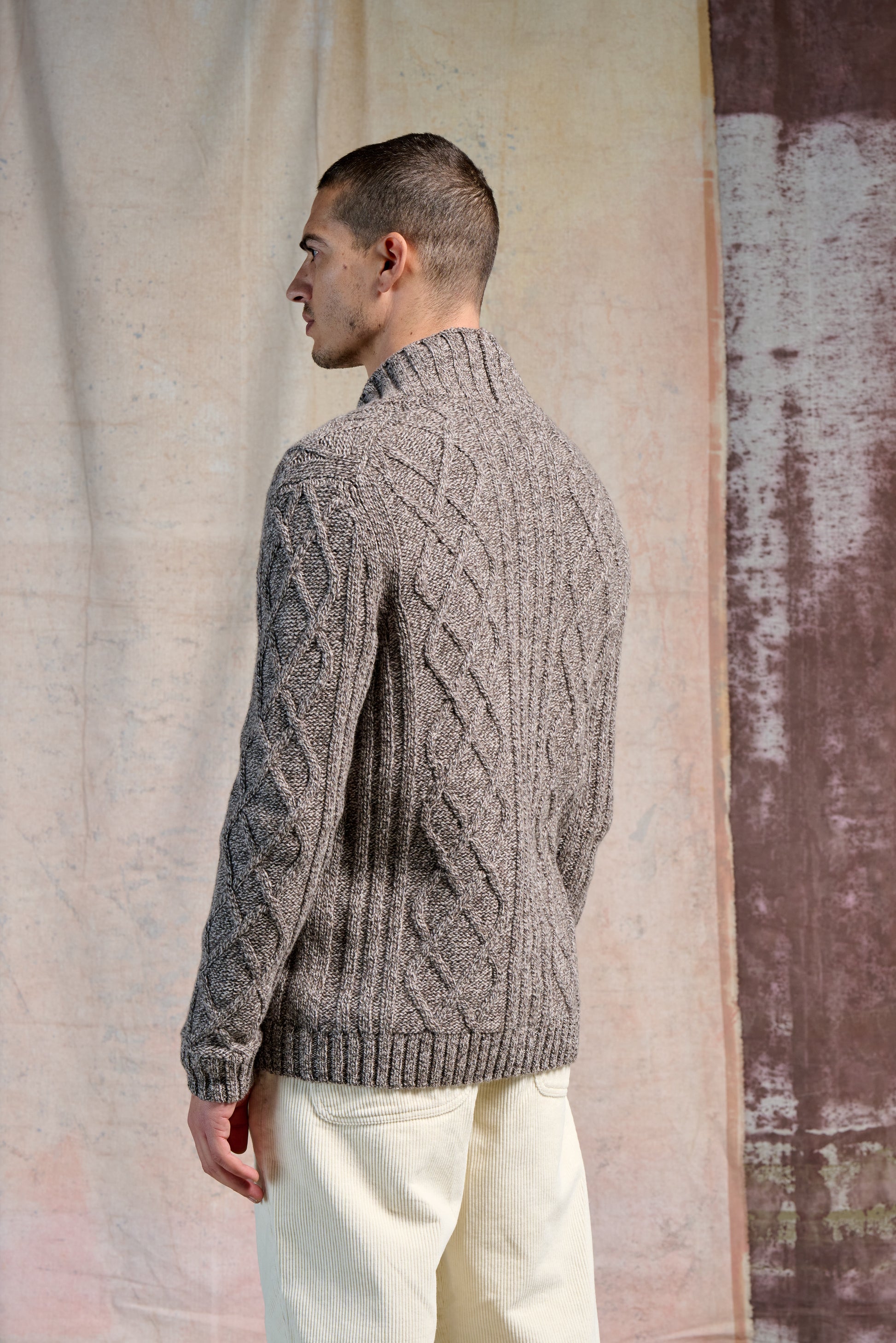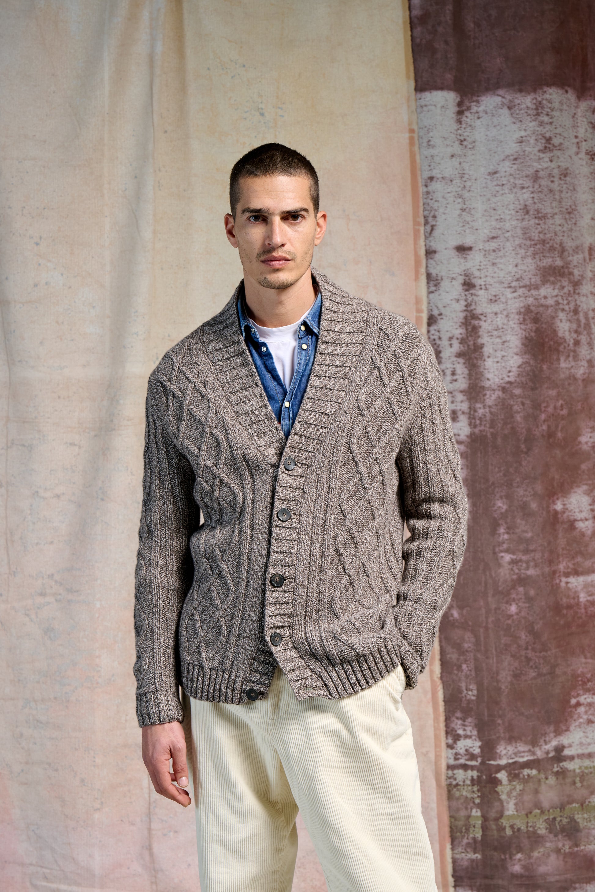 Cardigan Aran Silte Moulinè 3/15l, composto da supergeelong lana merino extrafine. Il termine mouline’ si riferisce a una particolare tecnica di filatura in cui due o più fili di
