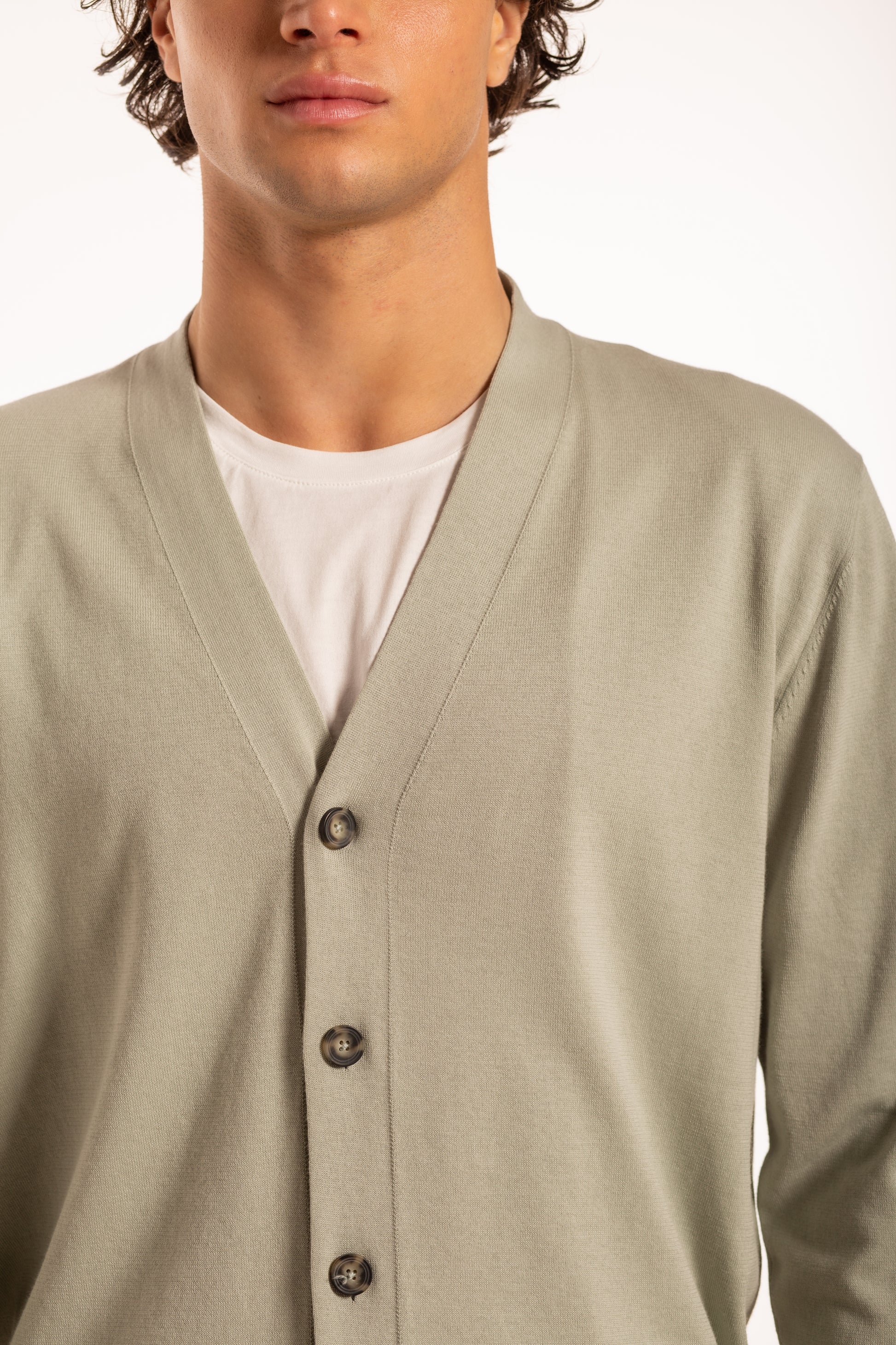 Cardigan rasato a manica lunga con scollo a V e chiusura con bottoni. Realizzata in cotone con tecnologia di filatura compatta COM4® Rieter, che riduce la formazione di pilling e garantisce una maggiore durata nel tempo.