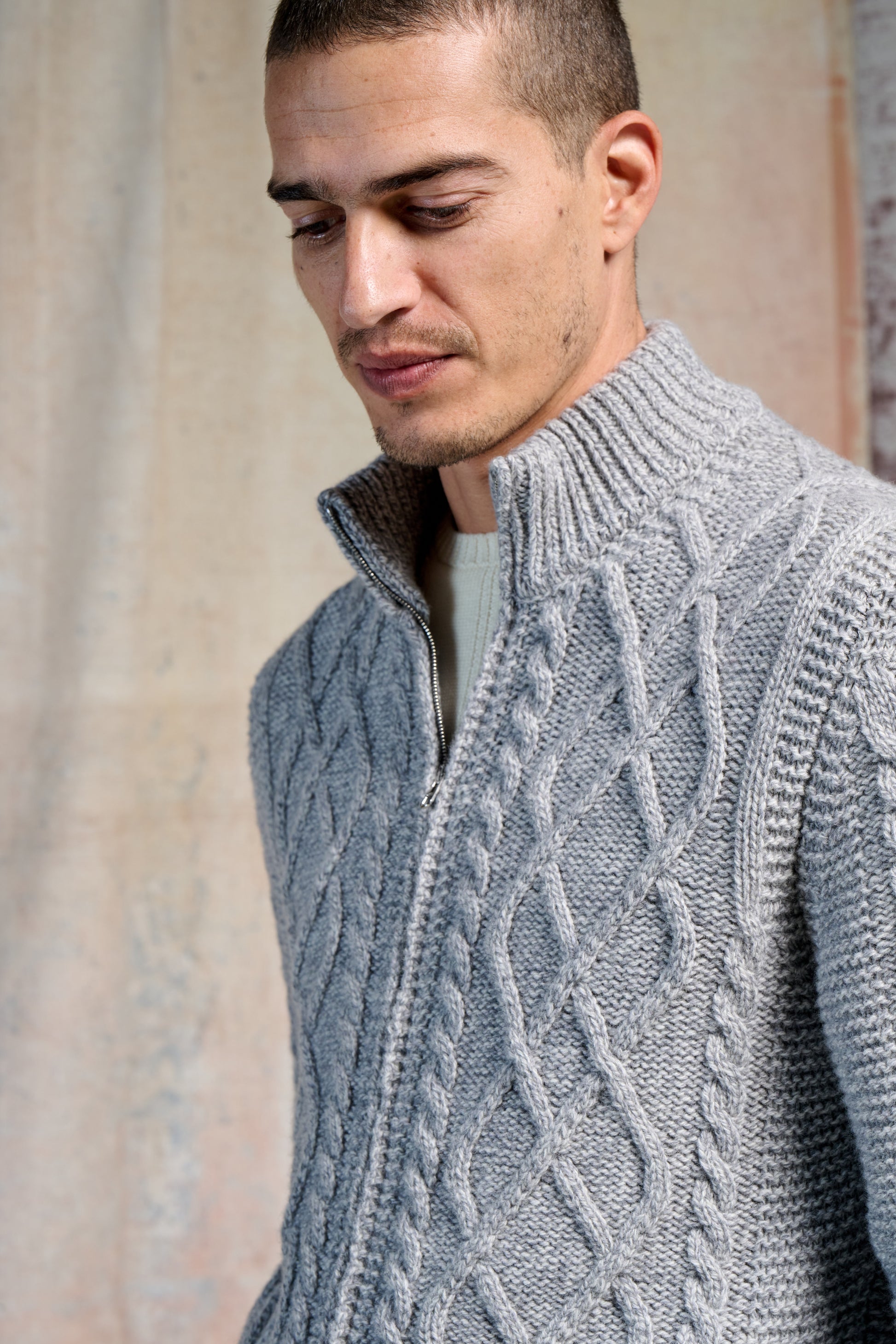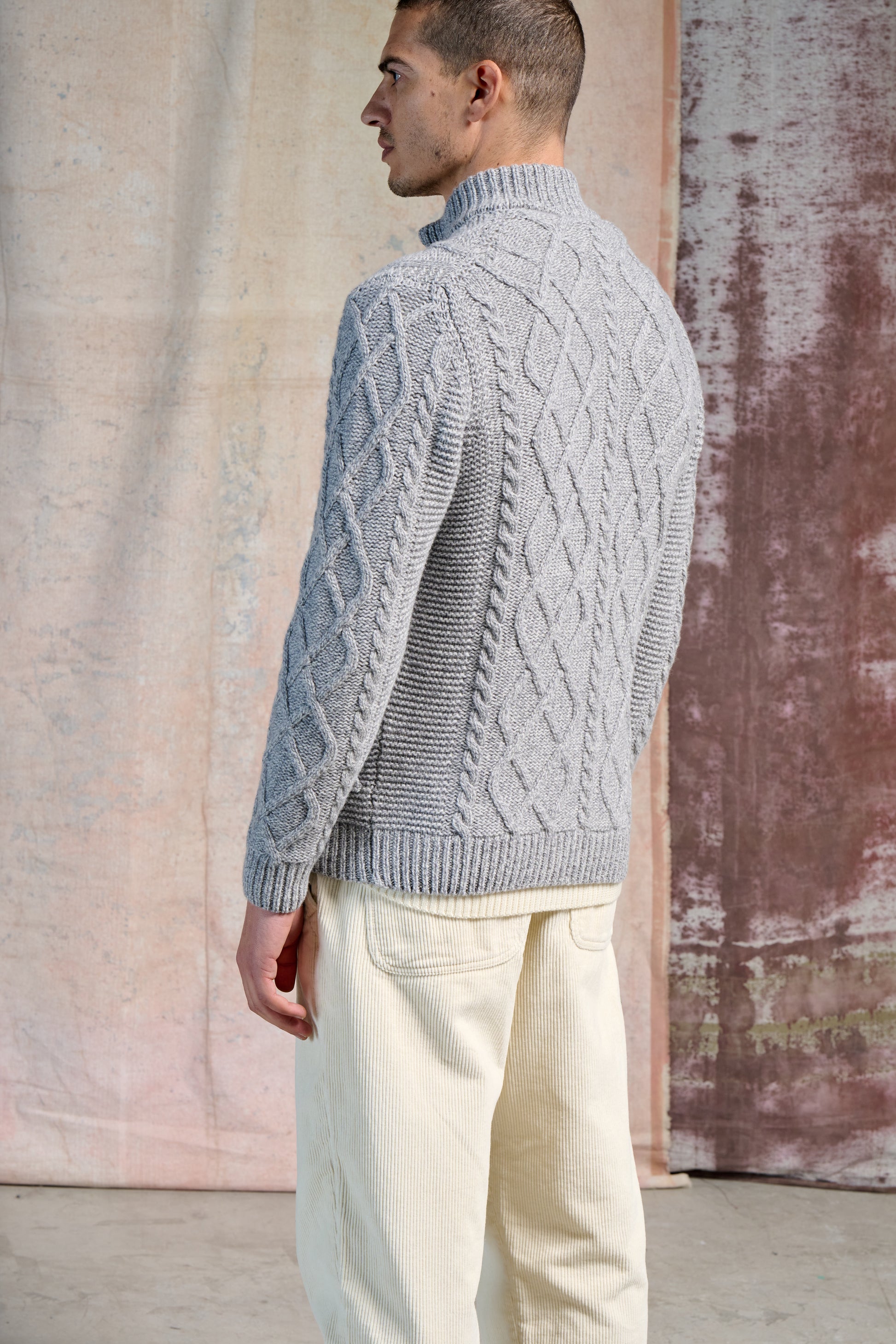Full Zip Trecce Sulte Moulinè 3/15l, composto da supergeelong lana merino extrafine. Il termine mouline’ si riferisce a una particolare tecnica di filatura in cui due o più fili di