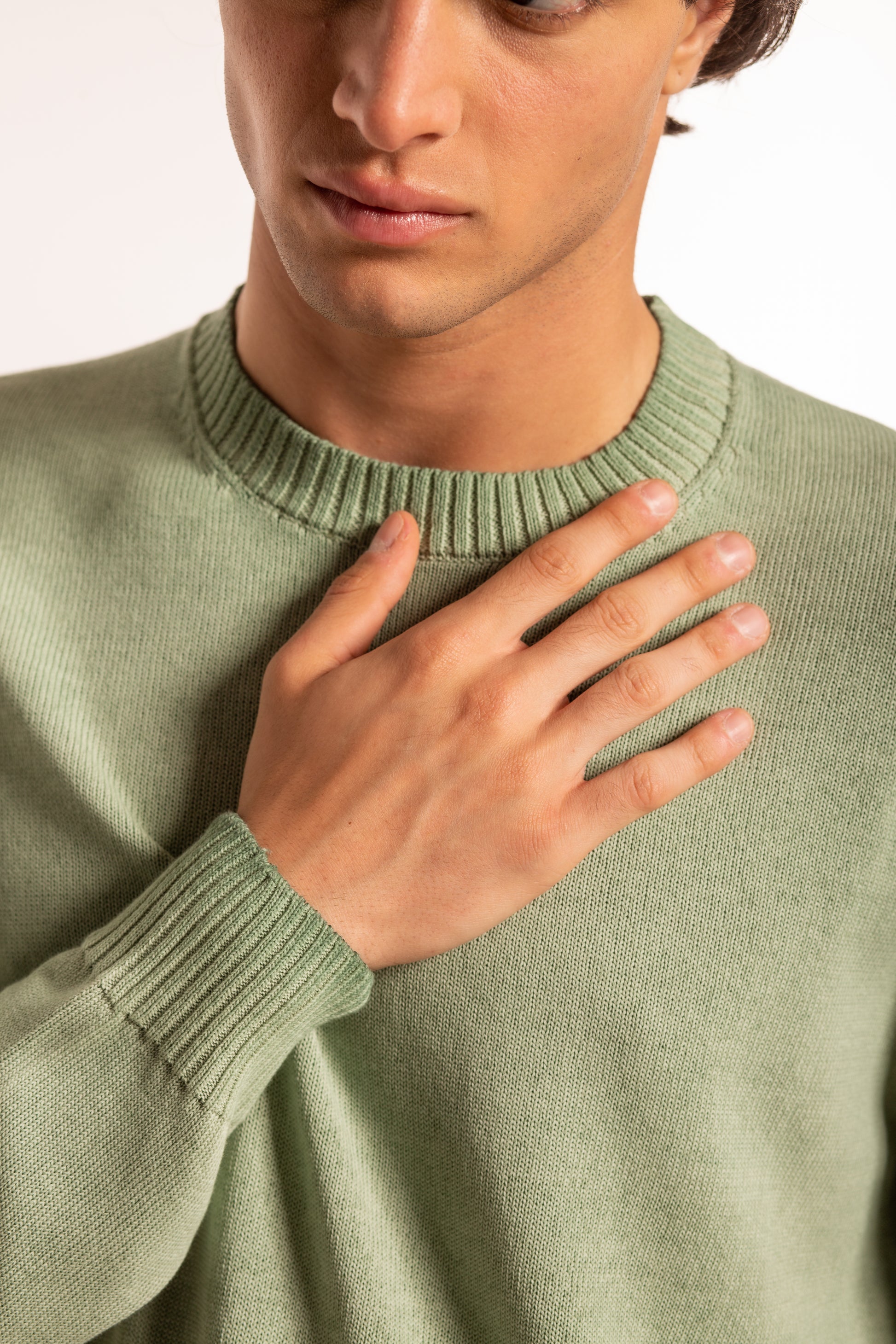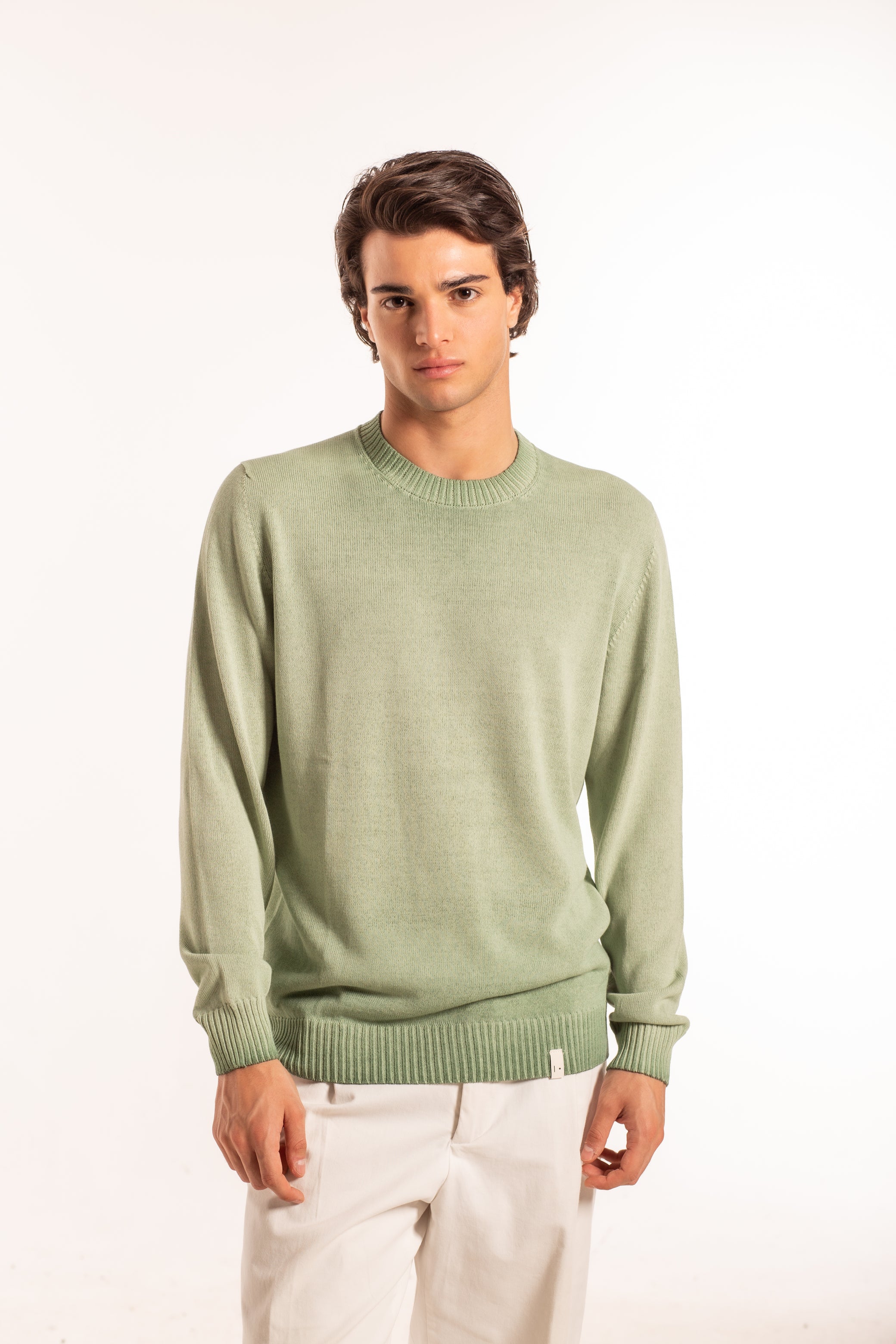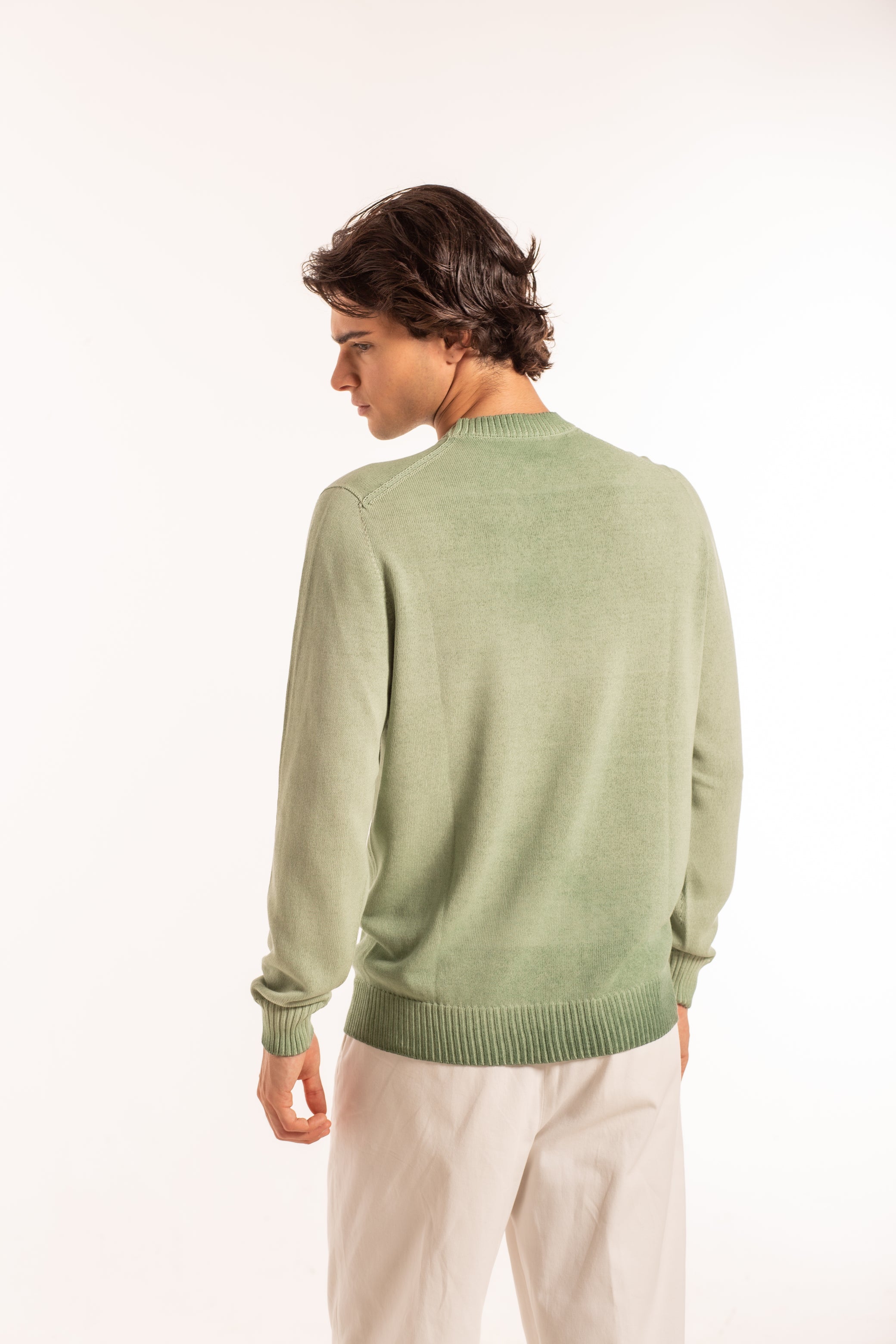 Girocollo manica lunga realizzato con tintura polare, un particolare processo di tinteggio per immersione che crea un effetto sfumato e materico. Il colore si deposita principalmente sulla superficie del capo, lasciando l’interno e le zone ripiegate più chiare e trasparenti. La lavorazione artigianale potrebbe generare leggere variazioni cromatiche, rendendo ogni capo unico.