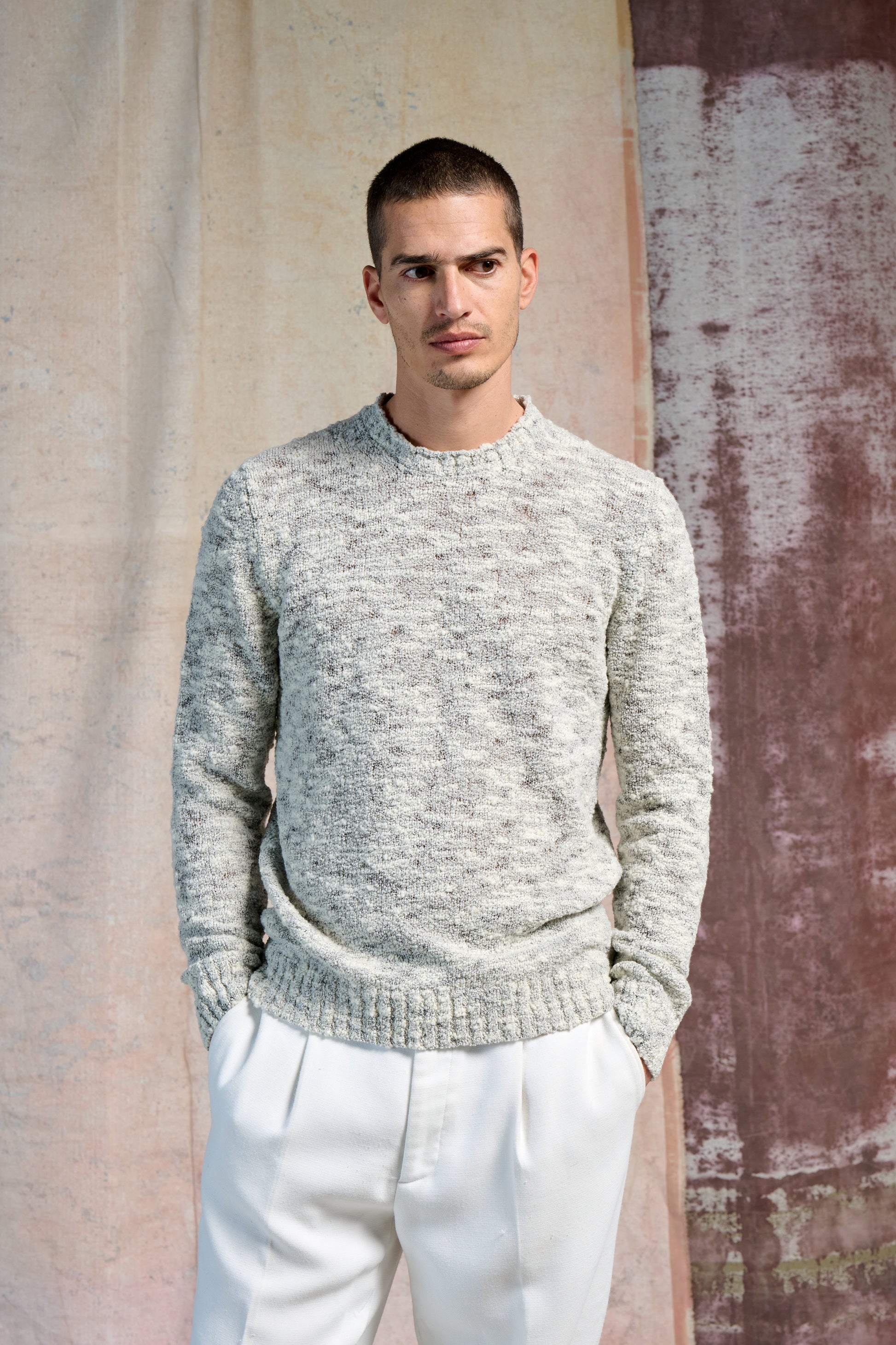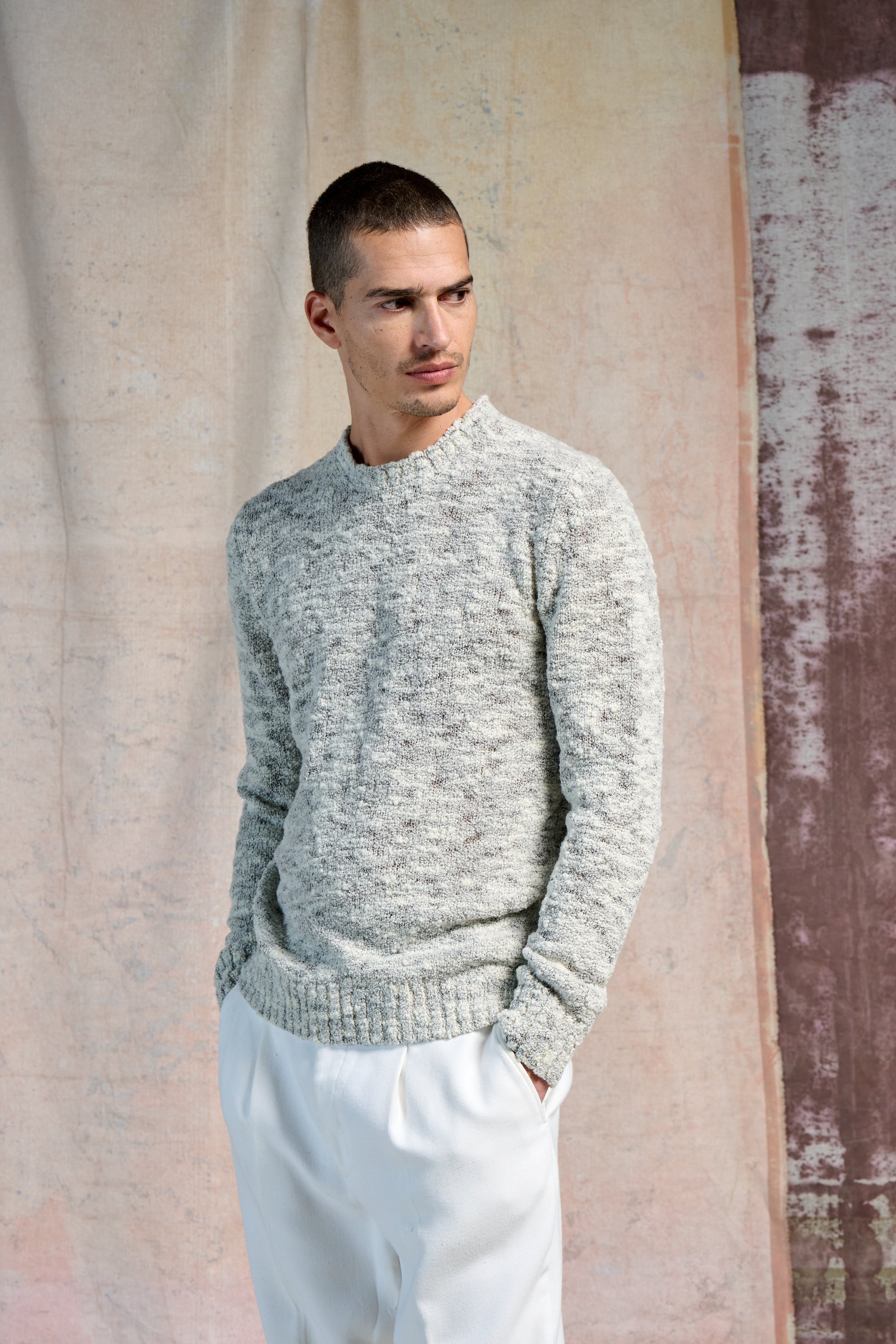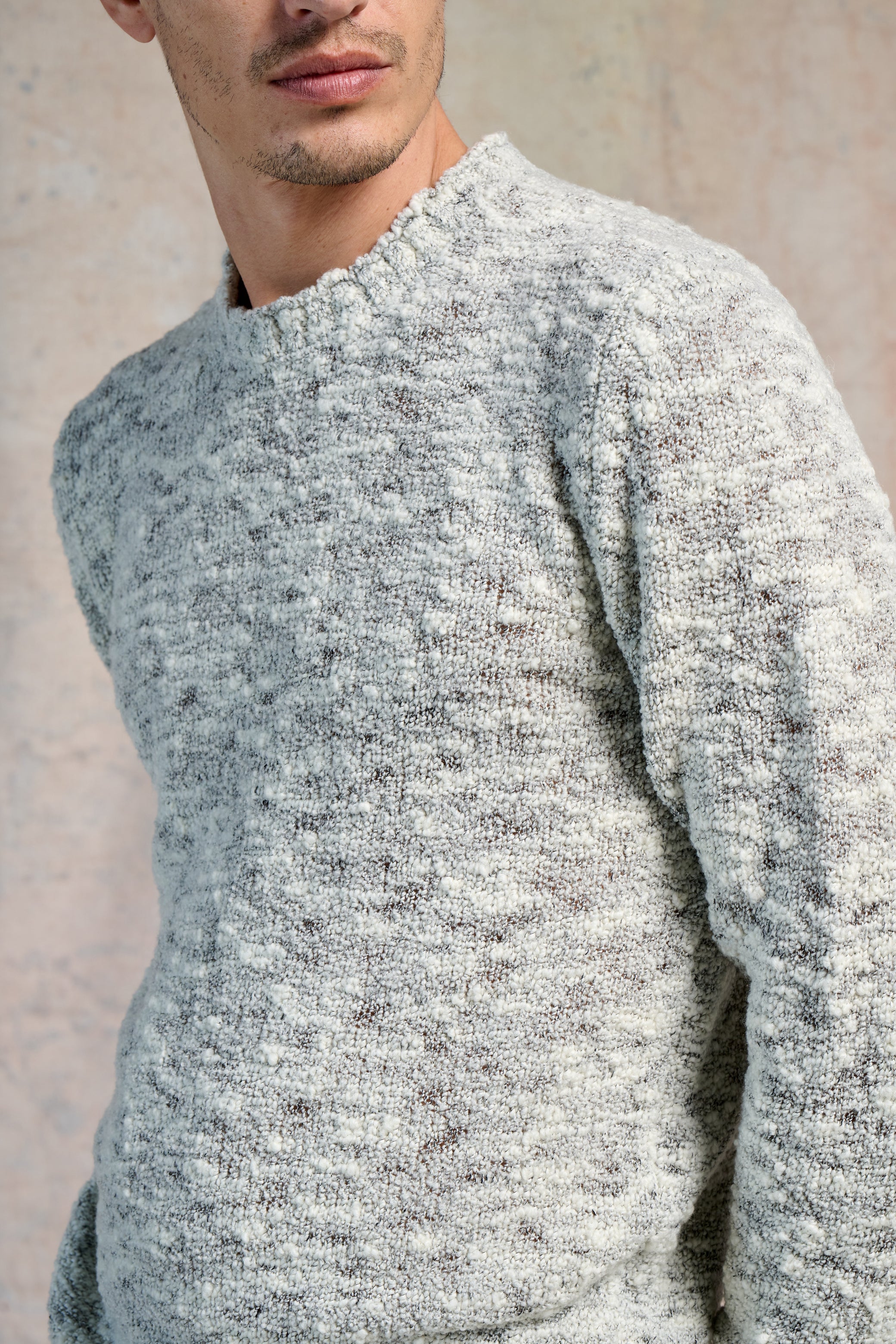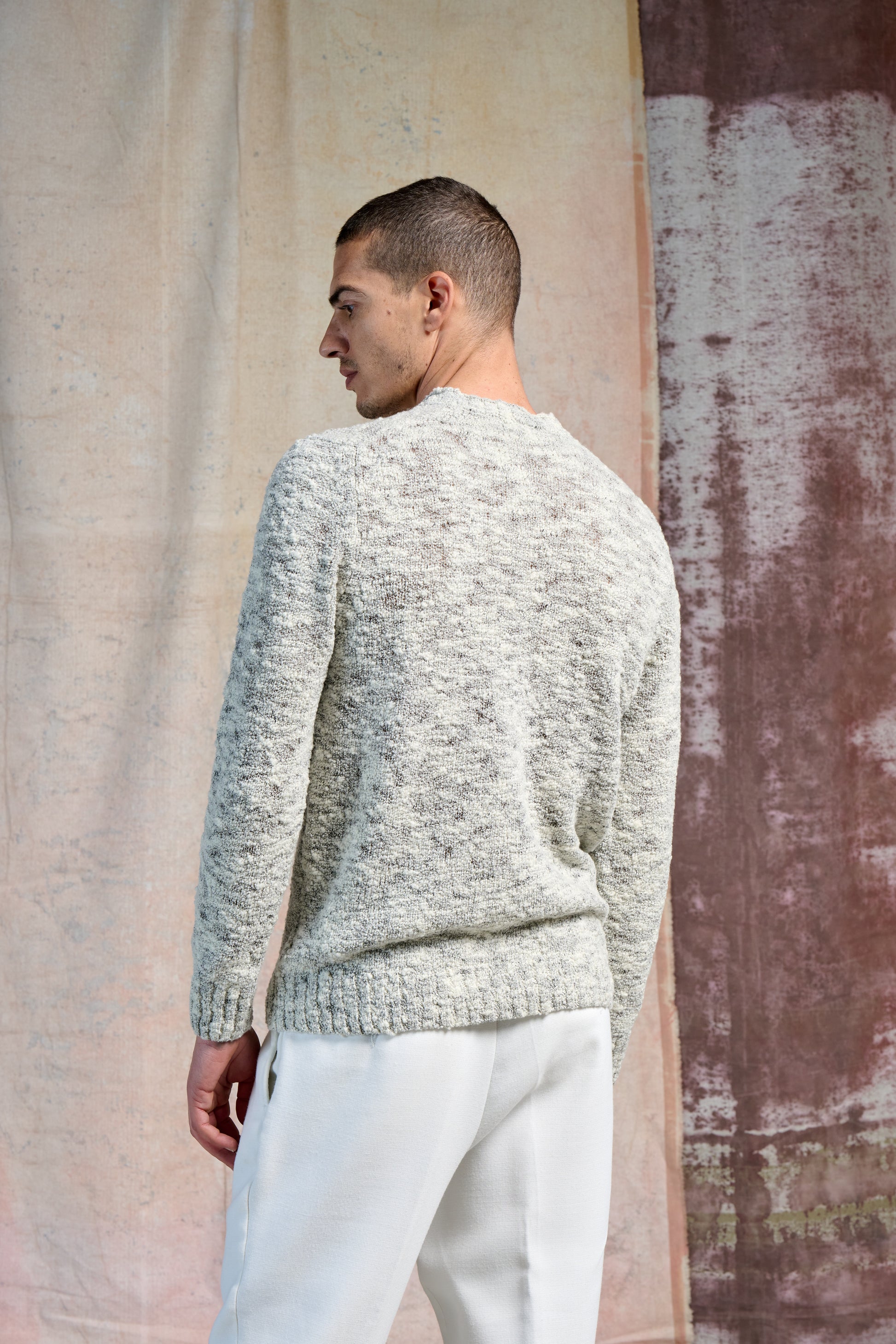 Girocollo Musk. Questo filato è un boucle’ ed è prodotto tramite differenti torsioni. Esso ha come caratteristica una struttura tridimensionale ed irregolare, ma soffice e confortevole.
