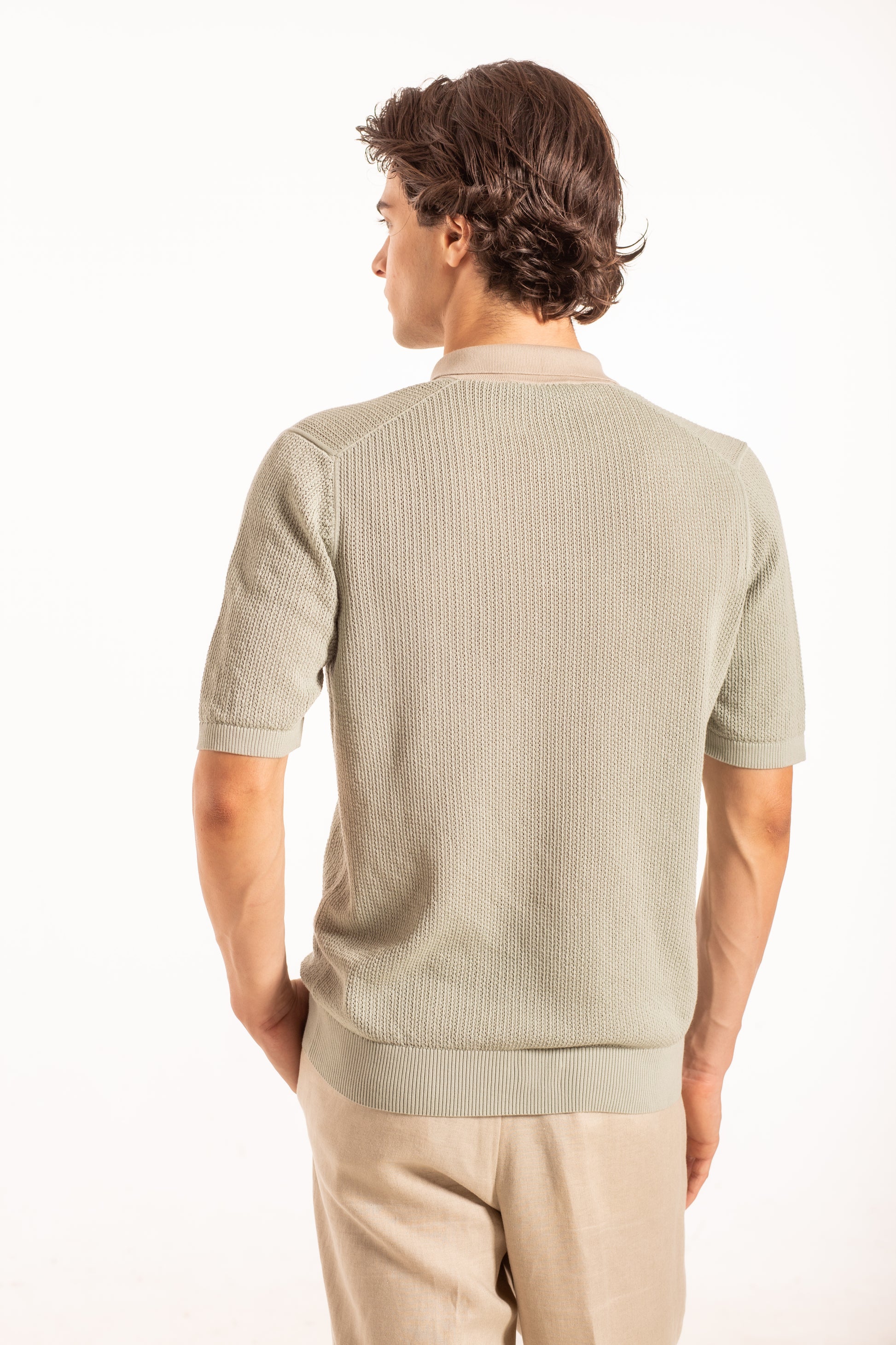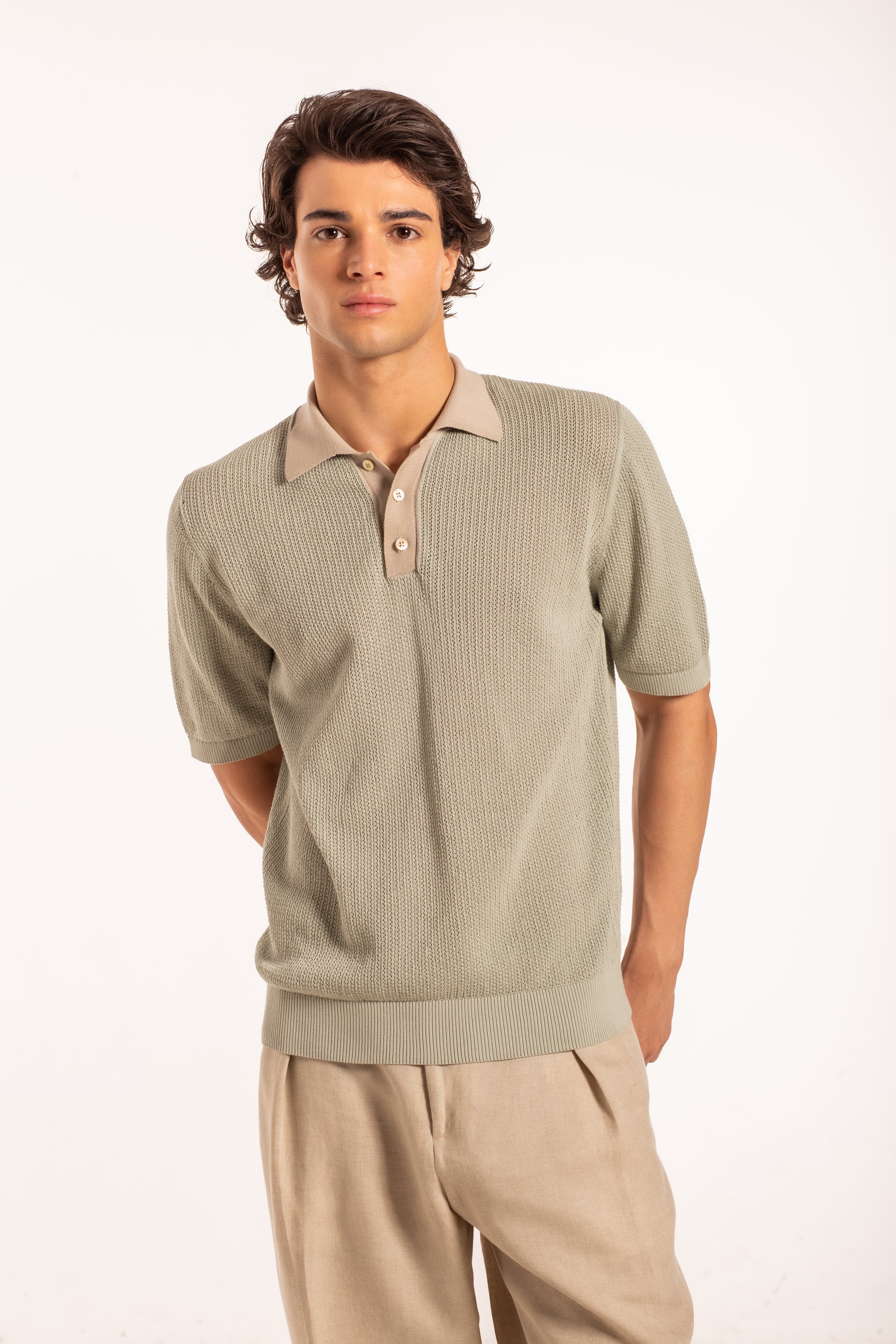 Polo a manica corta caratterizzata da colletto con colore a contrasto e chiusura con bottoni in madreperla. La particolare lavorazione del punto maglia dona al capo texture e profondità, valorizzandone l’eleganza contemporanea.