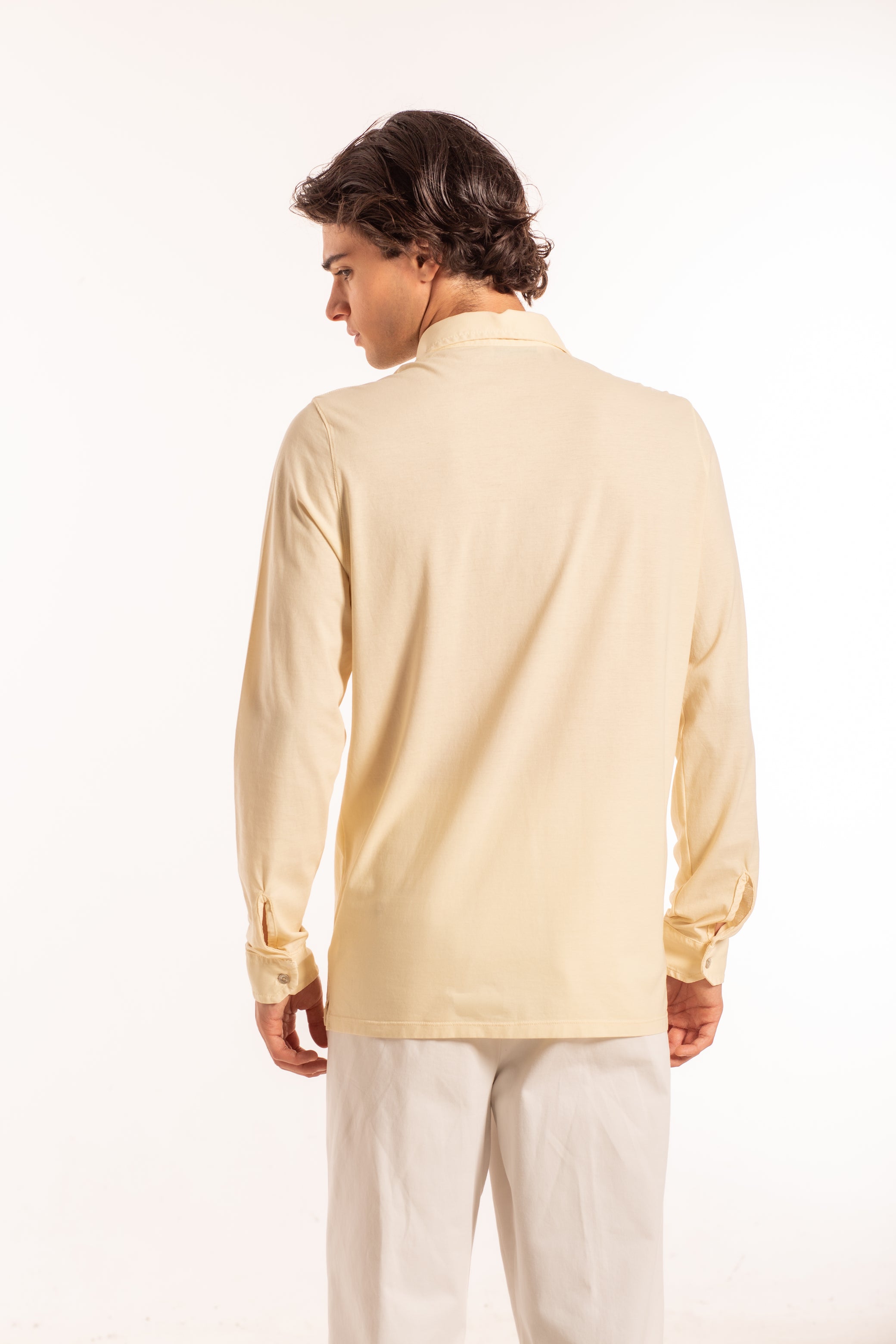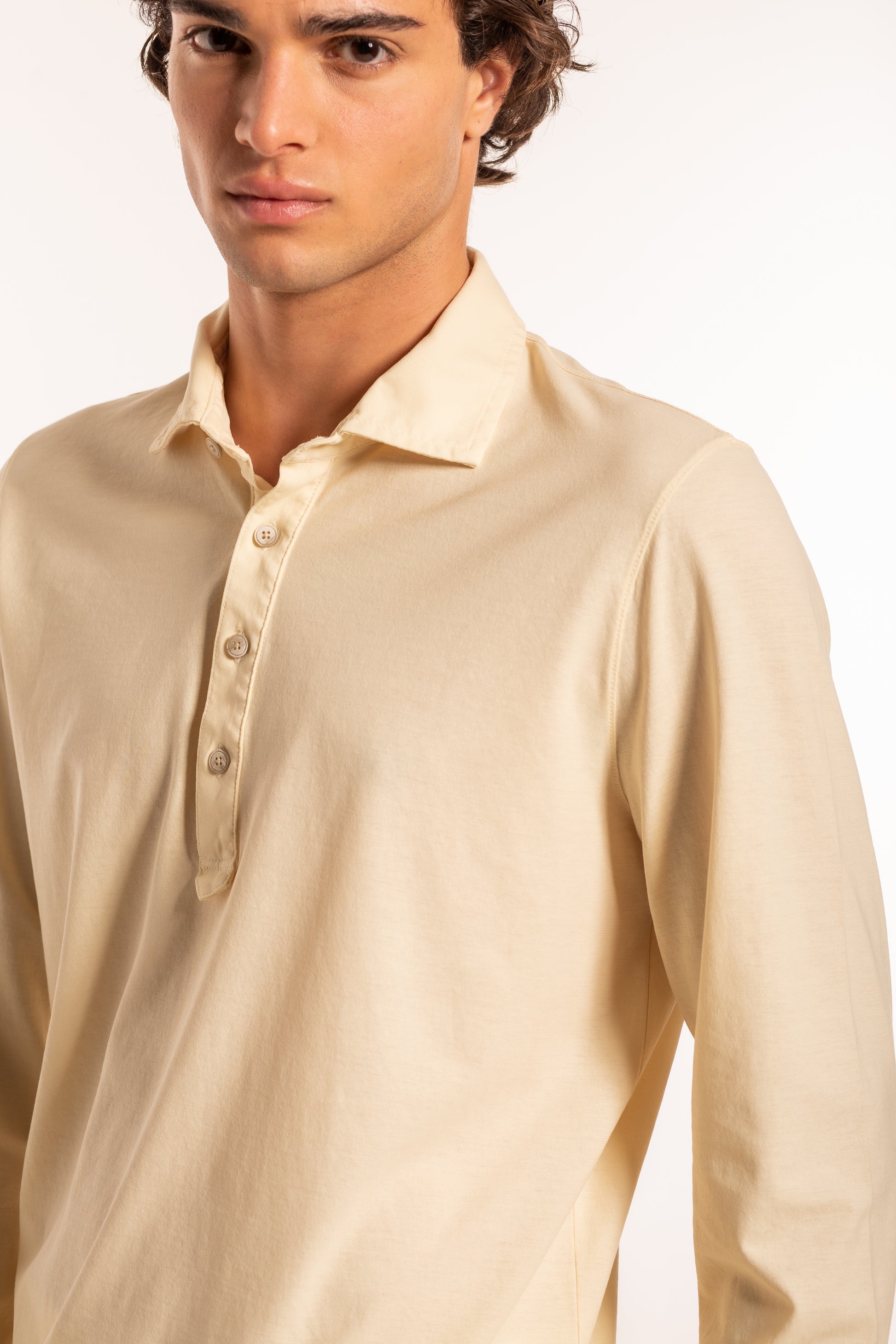 Polo camicia a manica lunga con colletto e apertura a tre bottoni, dallo stile essenziale e raffinato.