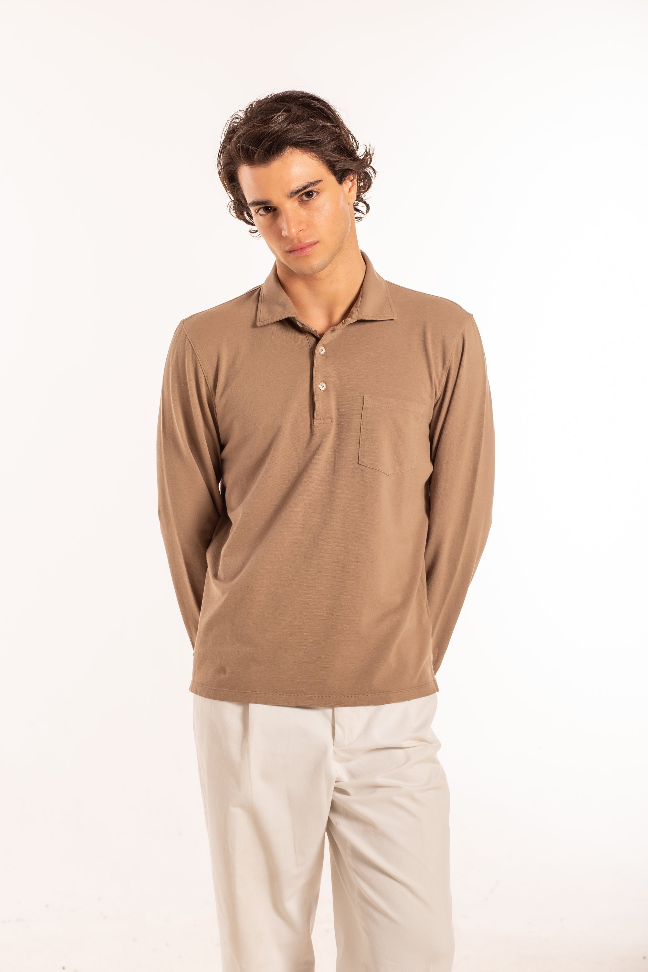 Polo a manica lunga con colletto e chiusura a tre bottoni, arricchita da tasca applicata, dal gusto classico e funzionale.