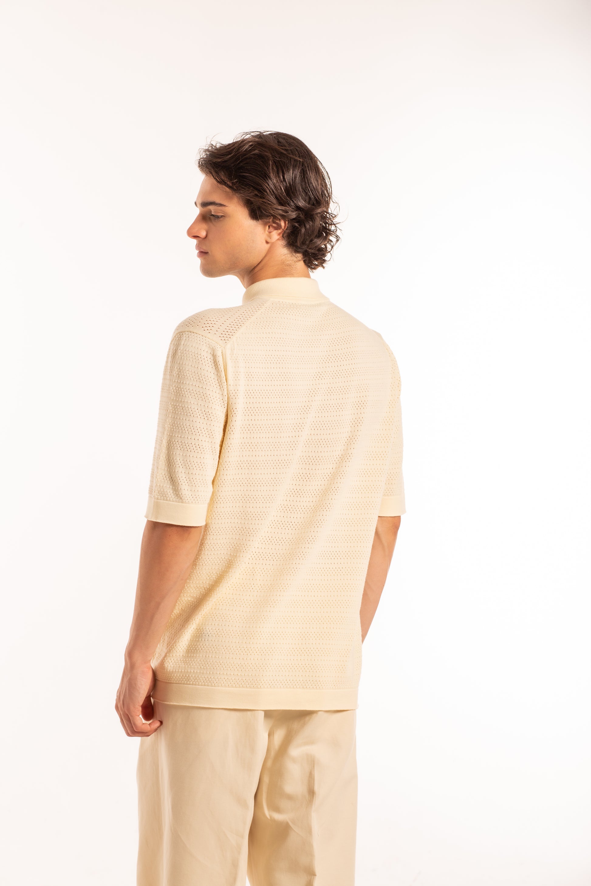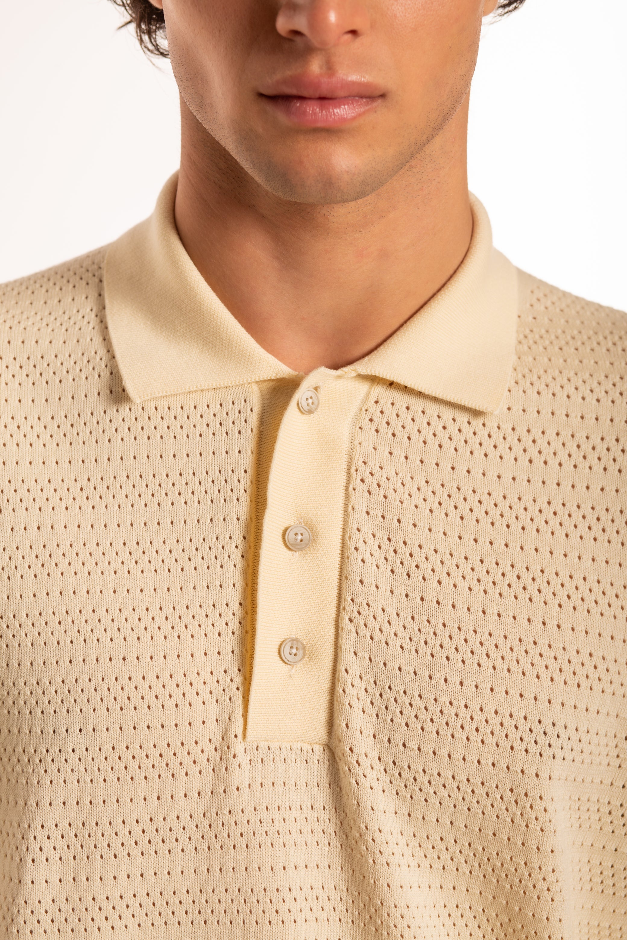 Polo a manica corta con chiusura a tre bottoni, realizzata con un punto maglia punzonato alternato che crea una texture raffinata e definita, valorizzando il carattere del capo.